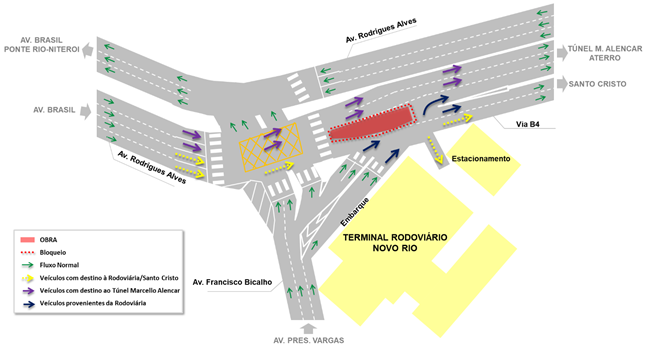 Os veículos provenientes da Avenida Brasil com destino à Rodoviária/Santo Cristo devem permanecer à direita da Via Expressa do Porto, e os veículos com destino ao Aterro/Zona Sul à esquerda.